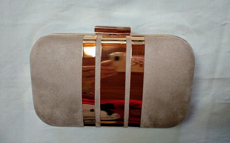 Bolso de fiesta ,clutch cartera de mano en antelina color crudo y bandas doradas en su parte delantera