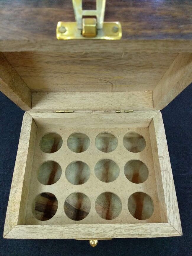 Caja de madera con compartimentos para guardar 12 aceites esenciales.