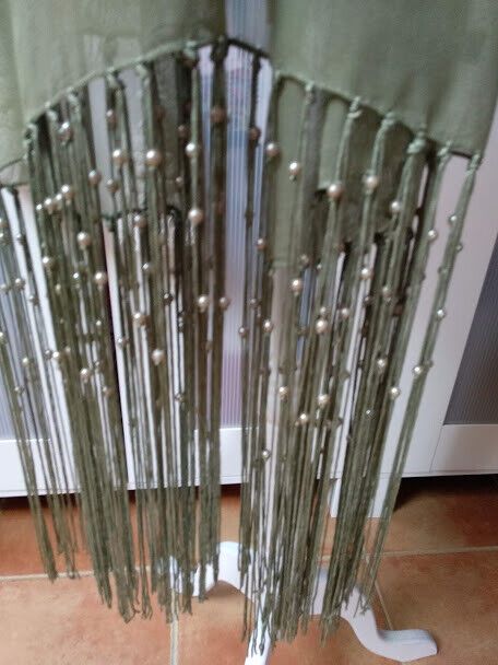 Delicado chal para fiesta o ceremonia en tejido tipo crepe en un precioso color verde.Rematado en sus extremos por un bonito fleco de seda con pequeñas bolitas insertadas.
