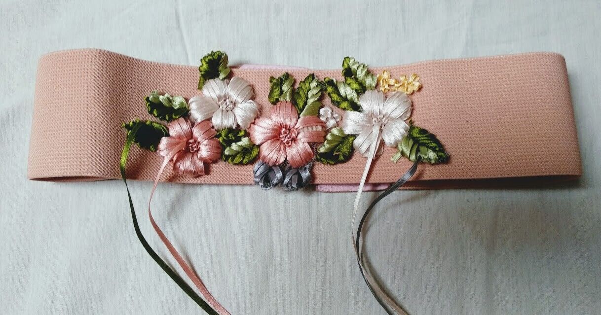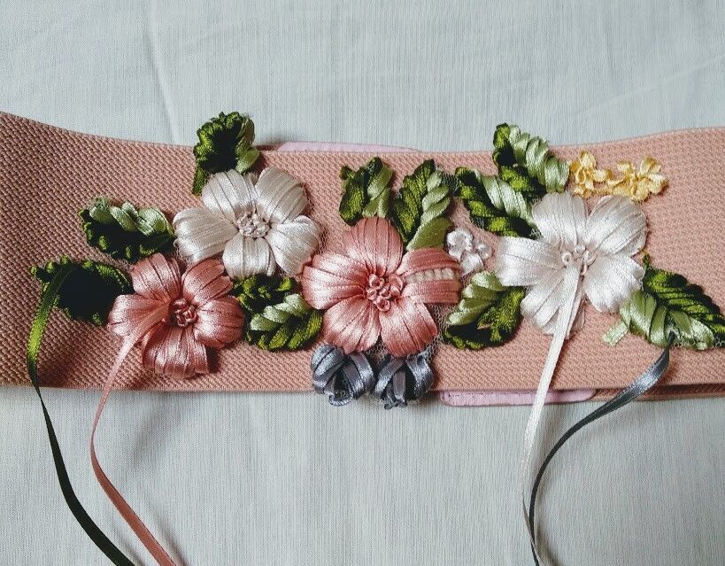 Precioso cinturón elástico de mujer tipo bohemio con goma elástica de color salmón .En su parte central lleva un adorno de flores bordadas en relieve realizado con cintas de raso en tonos azules,salmon,beig,verdes y amarillos.