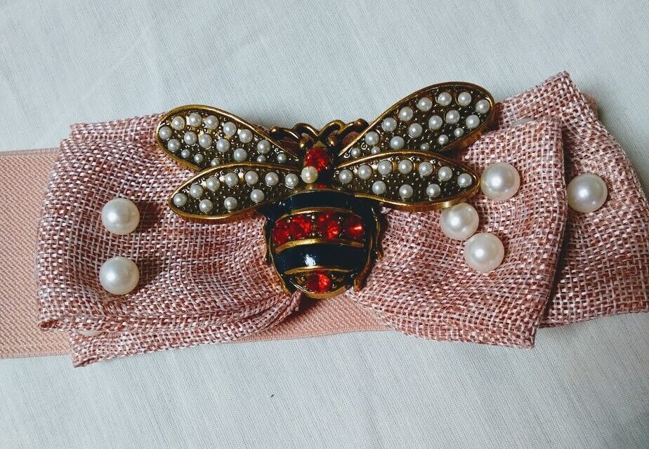 En su parte central lleva un lazo en tela con adorno de perlas y abeja central tipo Gucci.