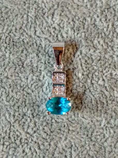 Colgante en Plata de 1ª Ley Rodiada con forma alargada con una bonita piedra de color azul tallada engastada con garras.