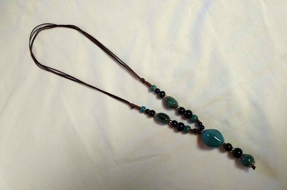 Original collar tipo étnico combinado de cuentas de cerámica en tonos azules con cordón encerado.