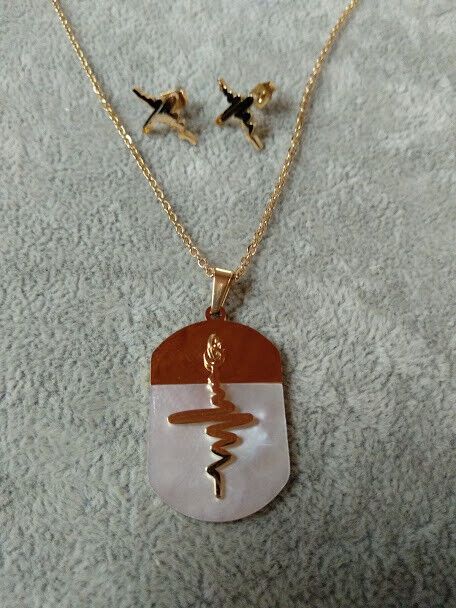 El colgante es una chapa de acero cubierta en parte por madreperla y con un colgante en acero .Su tamaño es de 3 cm de alta X 2 cm de ancho aproximadamente sin contar el asa para que pase la cadena y el colgante 2 cm de largo aproximadamente .