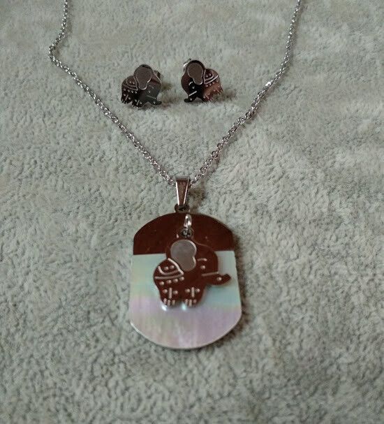 El colgante es una chapa de acero cubierta en parte por madreperla y con un colgante en acero con forma de elefante .Su tamaño es de 3 cm de alta X 2 cm de ancho aproximadamente sin contar el asa para que pase la cadena y el colgante 1,5 cm de alto X 1 cm de ancho aproximadamente .
