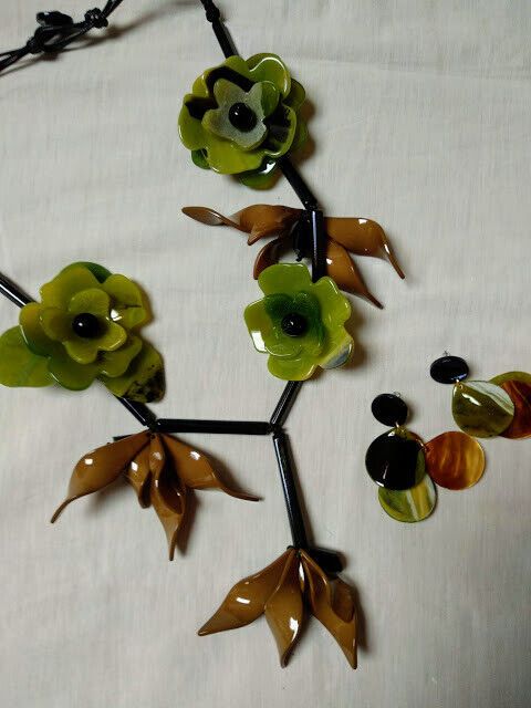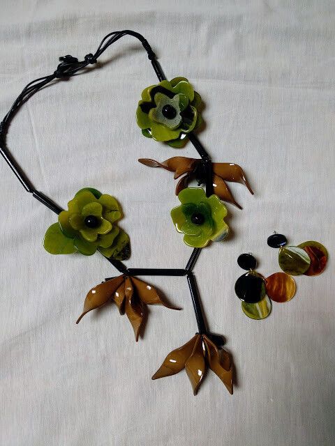 Precioso conjunto de collar y pendientes en acetato en tonos marrones,verdes y negro.