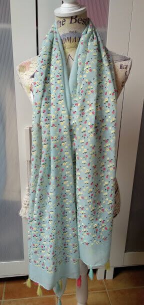 Delicado fular de mujer con estampado de flores y pequeños borlones en los extremos.