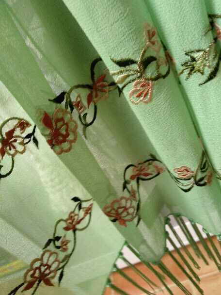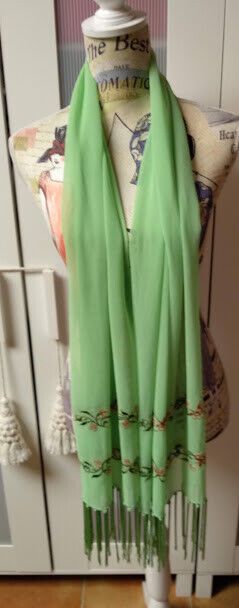 Delicado fular de mujer color verde con bordados en sus extremos en tonos verdes y marrones.Lleva un remate de flecos de seda.