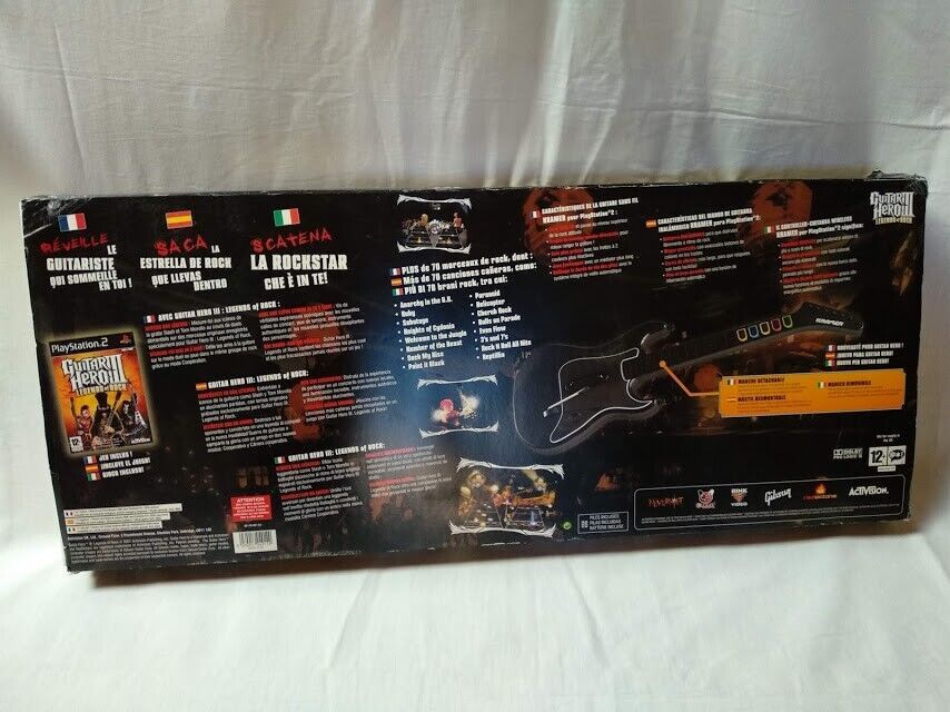 La caja incluye el juego Guitar Hero III,el mando de guitarra inalambrica Kramer,una bandolera ajustable y una hoja de adhesivos.Mastil de la guitarra desmontable para poder llevártela de viaje o guardarla fácilmente ,se bloquea para que obtengas la mejor estabilidad mientras rockanroleas.
