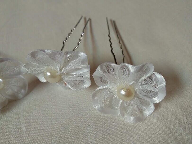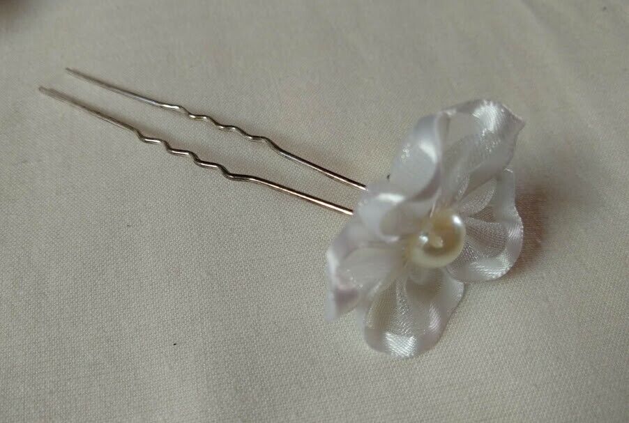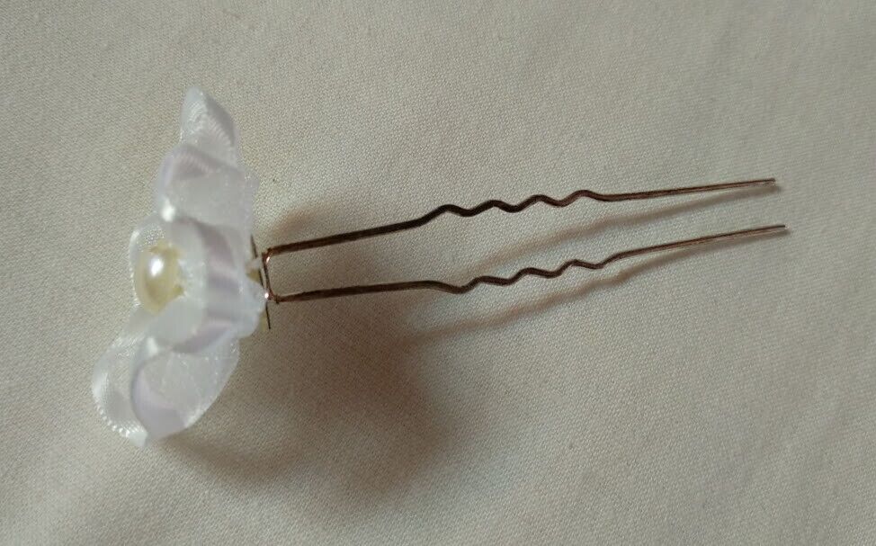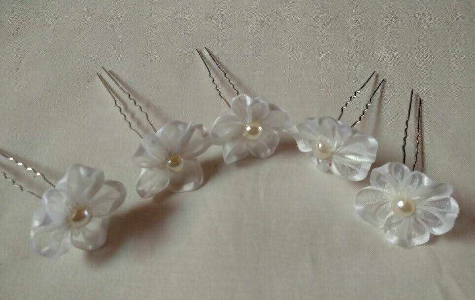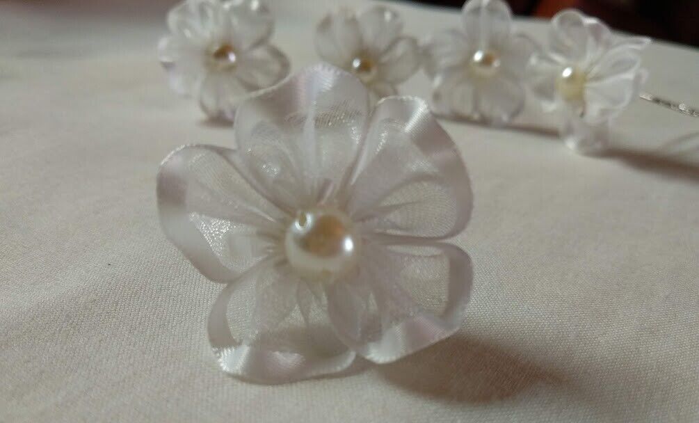 Pack de 5 bonitas horquillas moño mujer niña para adornar el pelo en color plateado cinta de organza en forma de flor rematada con una perla.