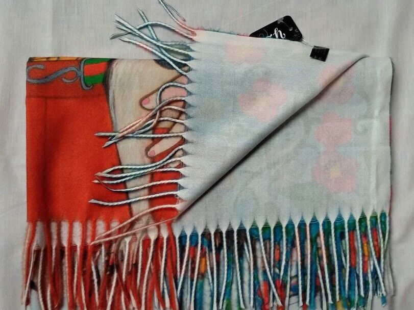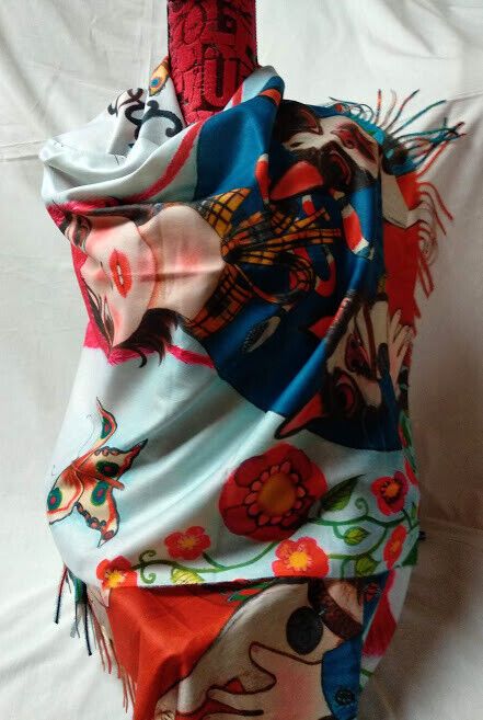 Estampado en una cara con posado de chica con dos perros.En la otra cara es lisa de un dulce color azul claro como se muestra en la foto detalle.