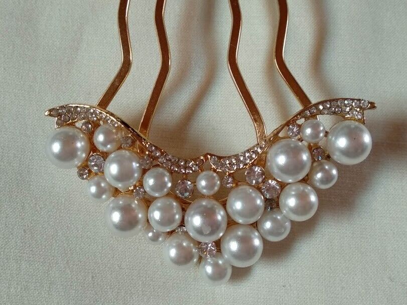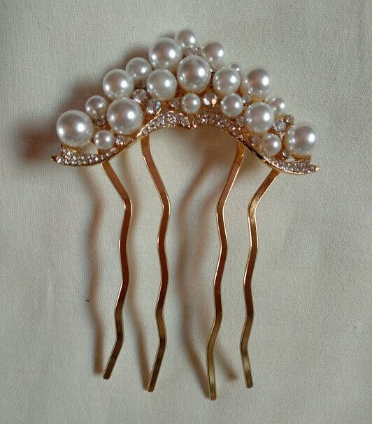 Bonita peineta mujer para adornar el pelo en color dorado cuajada de perlas.