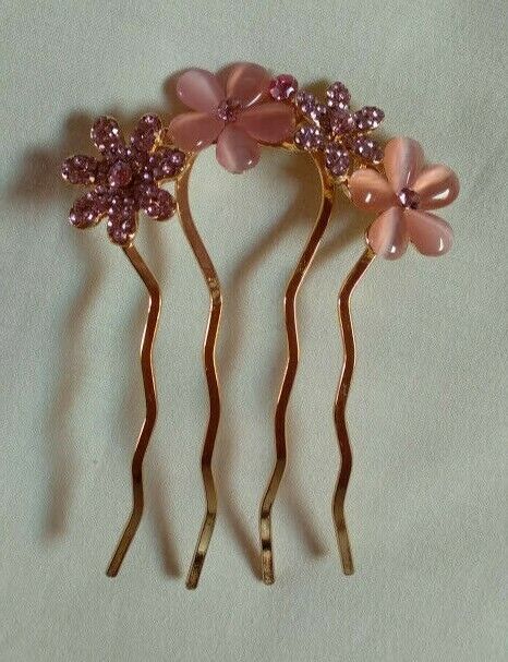 Bonita peineta mujer para adornar el pelo en color dorado con flores en color rosa y blanco.