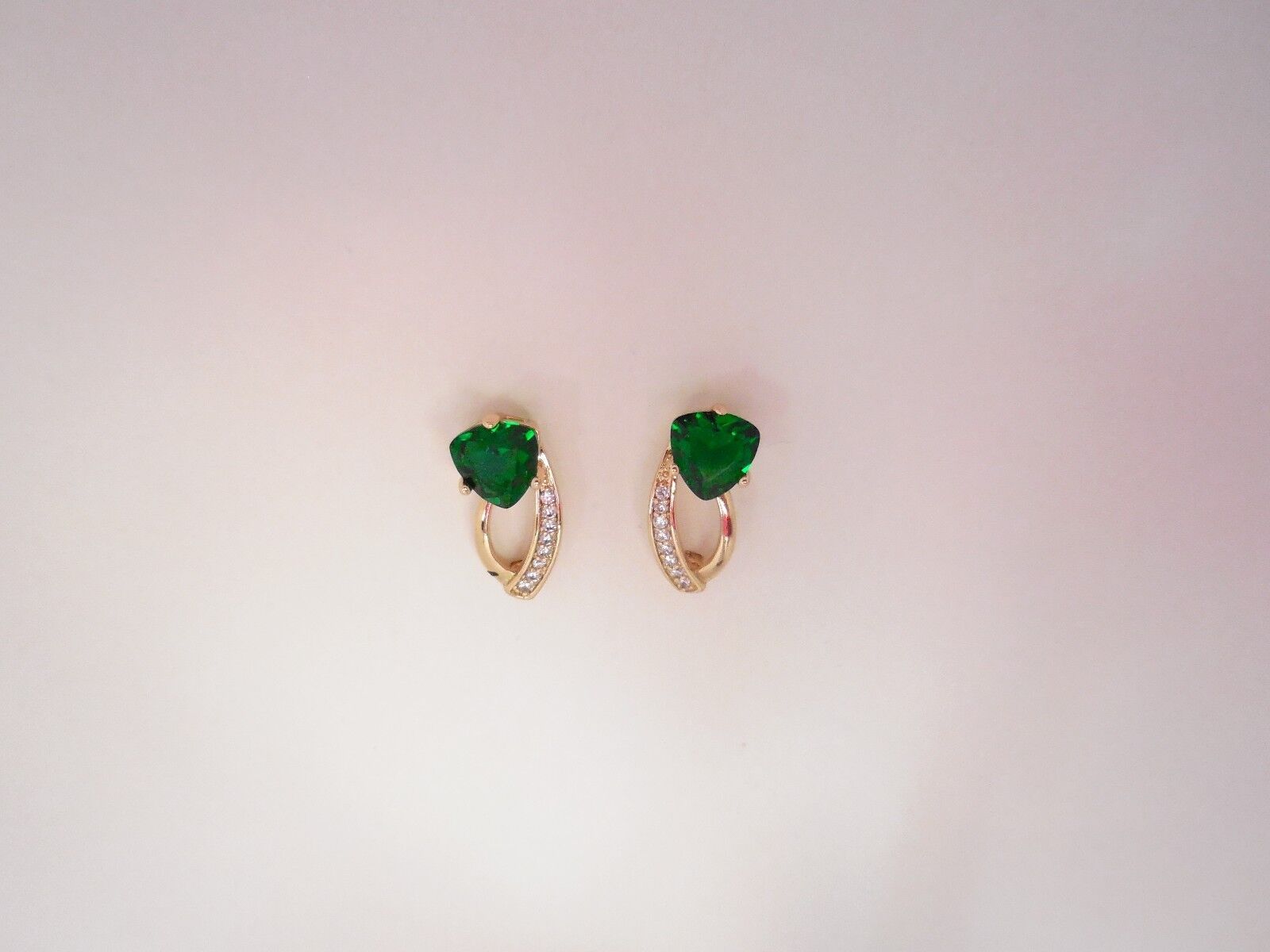 Pendientes de bisutería dorados con pequeños similes de color blanco y uno de mayor tamaño color verdel que lucirán dando brillo al rostro.