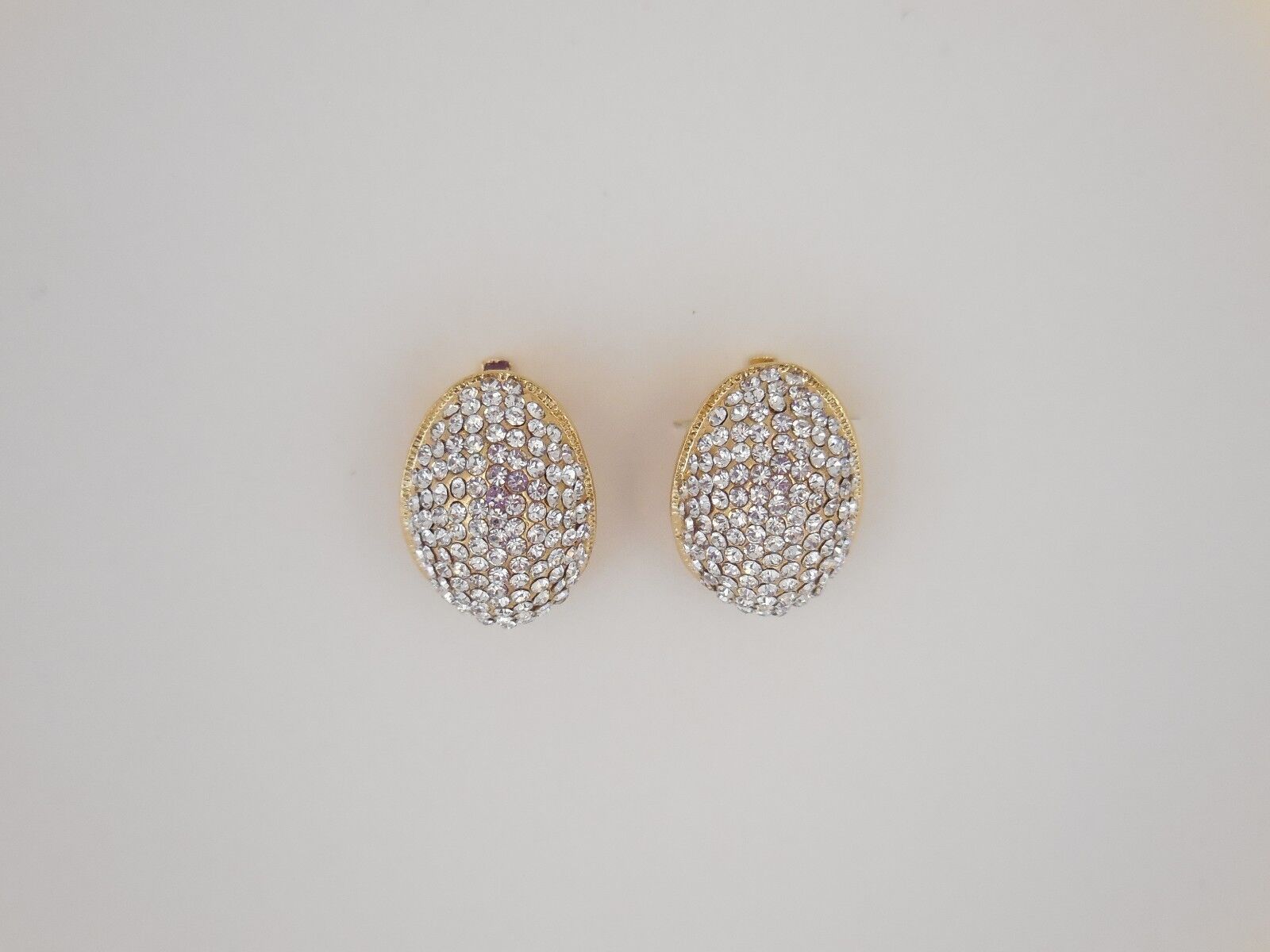 Elegantes pendientes de bisutería dorados cuajados de símiles blancos con cierre de clip.