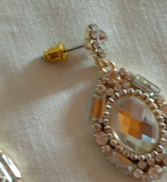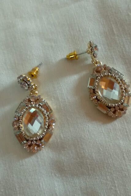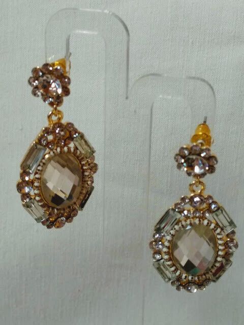 Elegantes pendientes de bisutería dorados de nuestra colección modelo Isabel Compuesto de bonitos cristales blancos tallados de diferentes formas y tamaños.