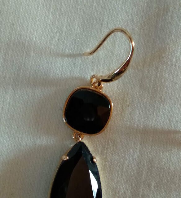 Elegantes pendientes de bisutería dorados de nuestra colección modelo Lagrima con piedras sinteticas de color negro talladas.