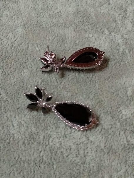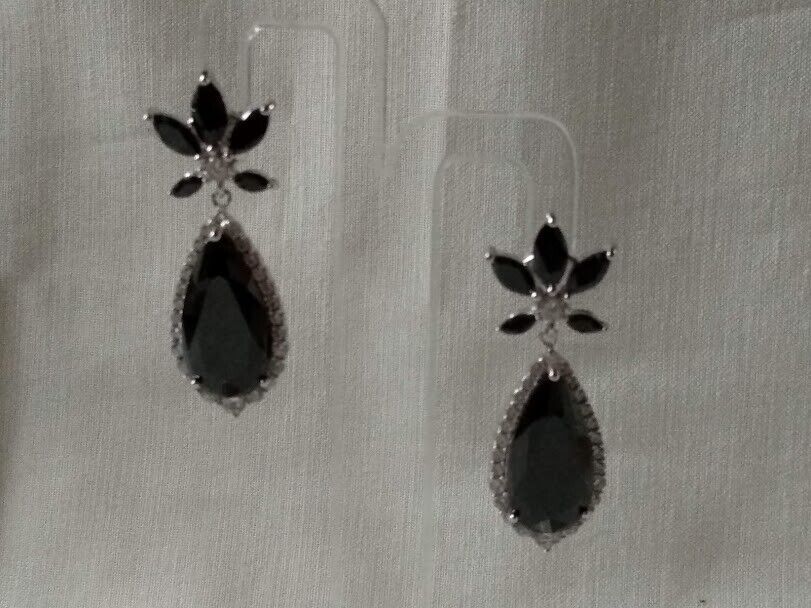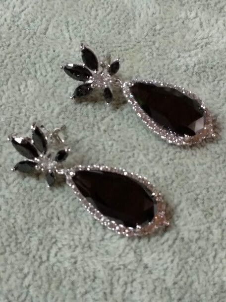 Preciosos pendientes bisuteria rodiada largos con circonitas color blanco rodeando una preciosa piedra tallada color ahumada en forma de lagrima engastada con garras y la parte superior en forma de flor