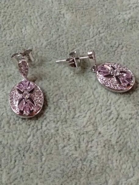 Preciosos pendientes bisuteria rodiada cortitos con piedras naturales rosa claro y cuajados de circonitas blancas.