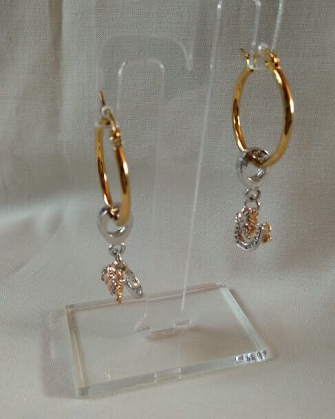 Preciosos y exclusivos pendientes de aro en acero dorado anti-alérgicos con colgante tipo pandora compuesto por una mariquita,una flor y una herradura en dorado y plateado.Se pueden usar con el colgante o quitando lo se convierte en un sencillo pendiente de aro. Los aros tienen un diámetro de 2,9 cm y los fetiches del colgante tienen un tamaño de 1 cm aproximadamente. Únicos y exclusivos Elegantes y femeninos para completar tu look mas sofisticados en eventos o veladas especiales o para tu día a día. Todos nuestros envíos son certificados y se realizan desde España.Suelen llegar en un máximo de 4 a 5 días laborables Por favor si el pedido se realiza desde Canarias tener en cuenta los especiales gastos de envío así como facilitar el nº de D.N.I. Gracias.
