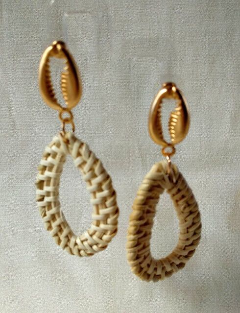 Juveniles y veraniegos pendientes de bisutería con adorno de ratan trenzado de forma ovalada.
