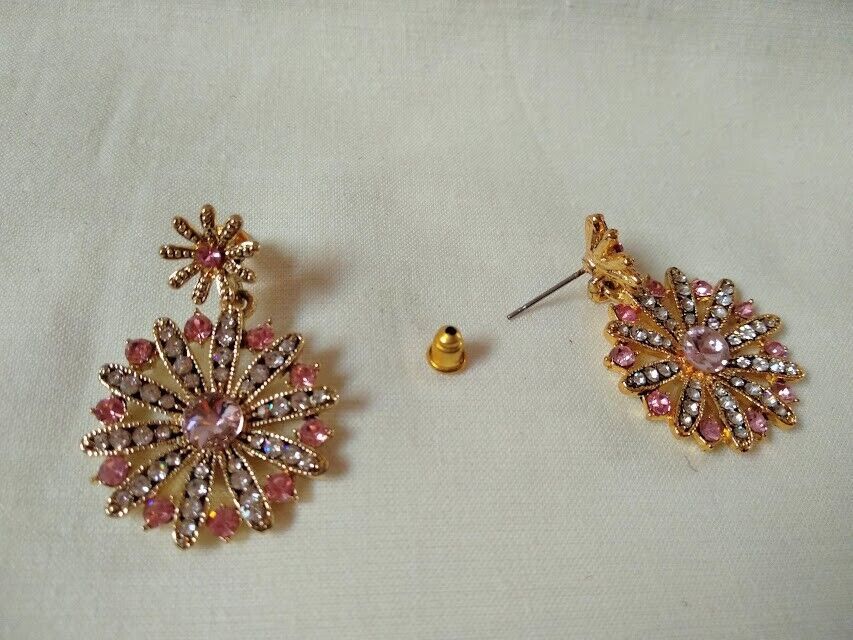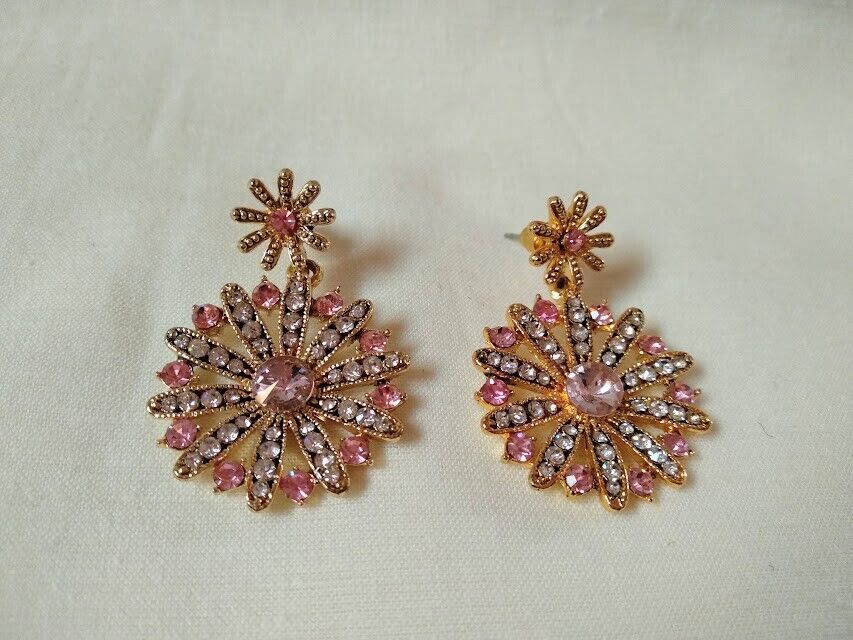 Largos en forma de flor con piedras color rosa y cristales blancos.