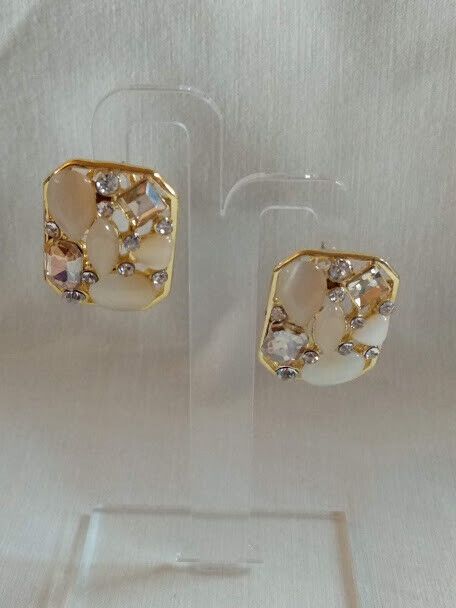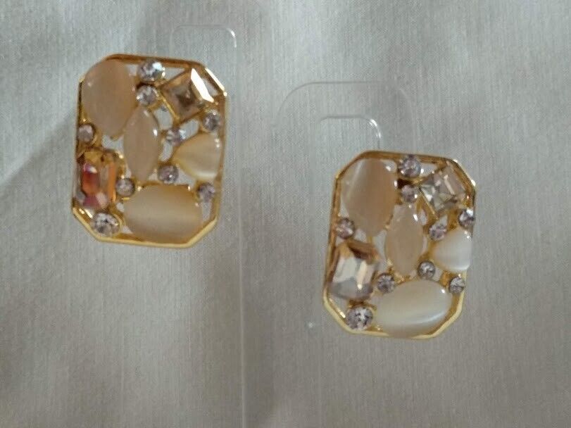 Cortos pegados al lóbulo con forma de rectangular con gran cristales y piedras de color beige.