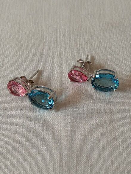 Preciosos pendientes en plata de ley rodiada largos con una piedra tallada rectangular de color azul claro y otra en forma de lagrima color rosa tambien tallada engastadas con garras.