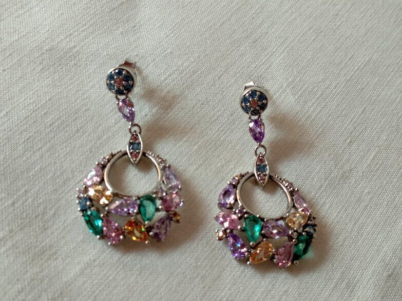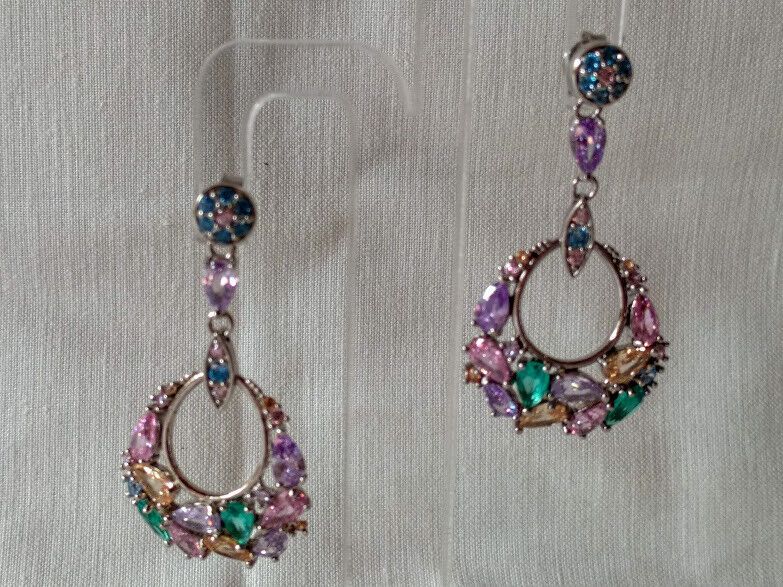 Preciosos pendientes en plata de ley rodiada largos cuajados de piedras en tonos pastel engastadas con garras