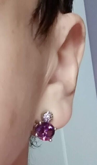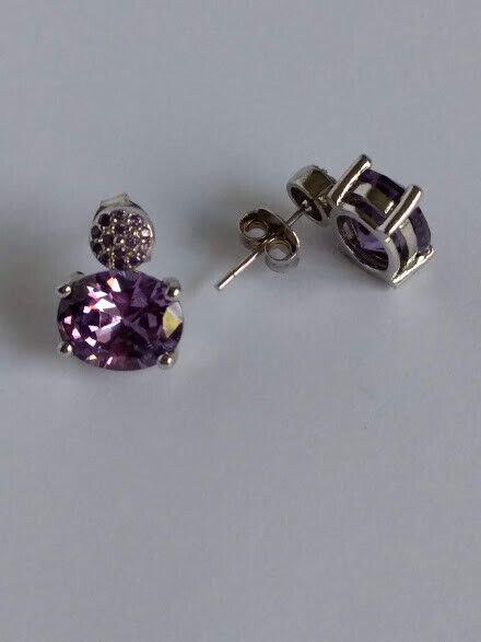 Preciosos pendientes tipo vintage en plata de ley rodiada con una amatista tallada en forma ovalada sujeta por 4 garras y en la parte superior lleva una pequeña bolita cuajada de piedrecitas que es donde va el pasador que atraviesa el lobulo para ponérselo.
