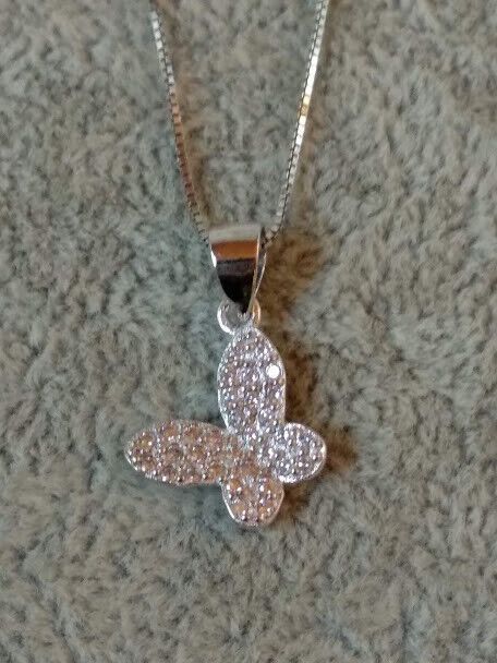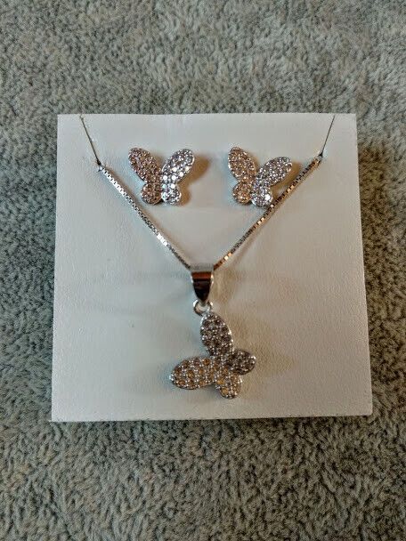 Precioso y delicado conjunto de pendientes y gargantilla en Plata de Ley con acabado de rodio con forma de mariposa cuajada de circonitas.