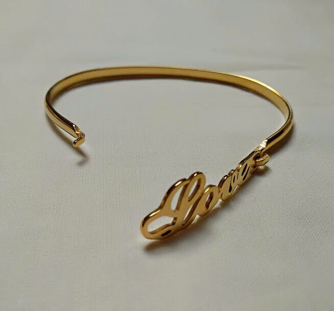 Bonita pulsera de acero inoxidable color dorado con cierre en la parte delantera con texto LOVE.
