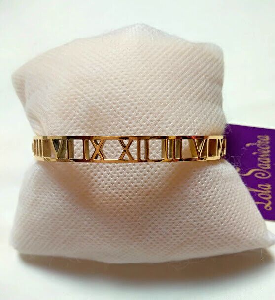 Bonita pulsera de acero inoxidable color dorado numeros romanos y cierre en un lateral.