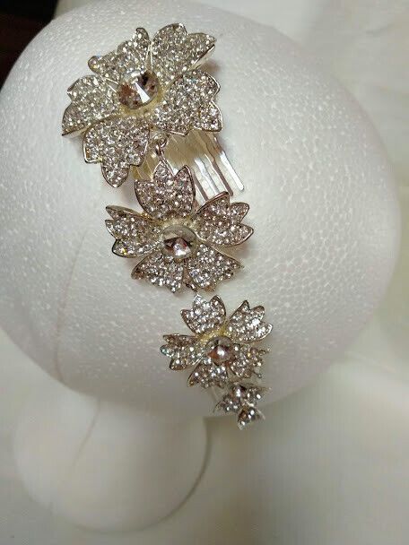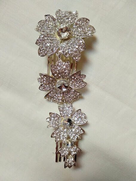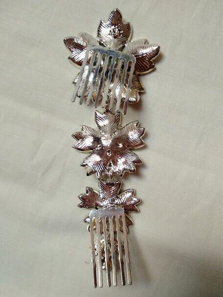 Bonito aderezo mujer para adornar el pelo en color plateado formado por tres flores en cascadacuajadas de símiles color blanco de diferentes tamaños