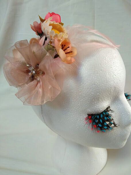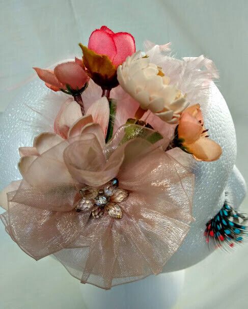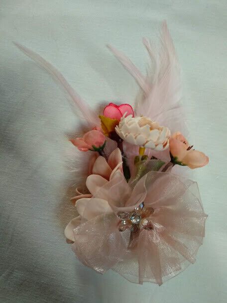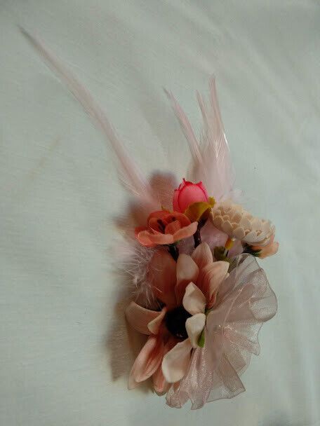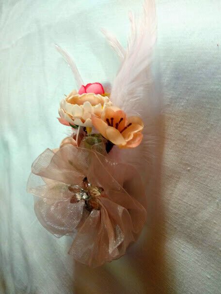 Bonito tocado mujer de flores de tela en tonos salmón.
