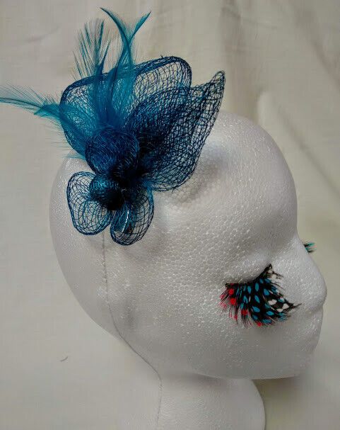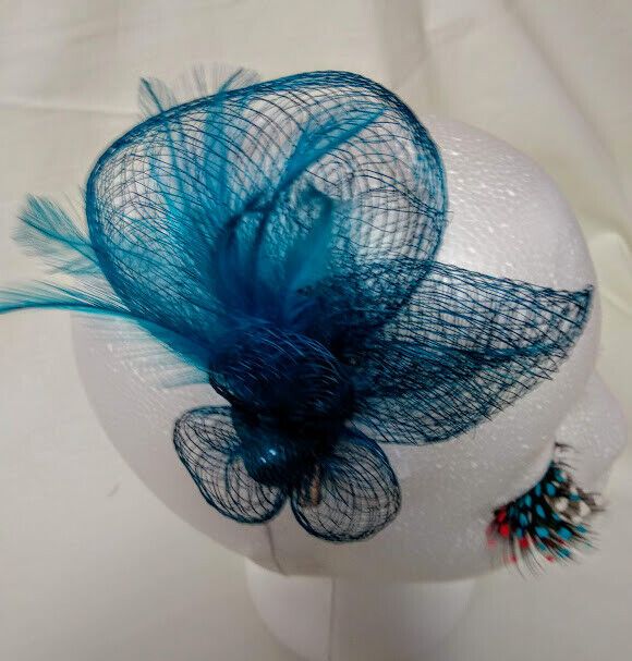 Bonito tocado para ceremonia color azulon con forma de flor confeccionado con rafia y plumas.