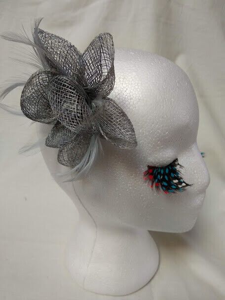 Bonito tocado para ceremonia color gris con forma de flor confeccionado con rafia y plumas.