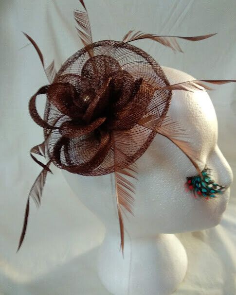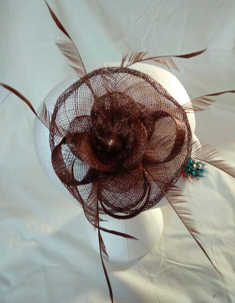 Bonito tocado para ceremonia color marrón con forma de flor confeccionado con rafia y plumas.