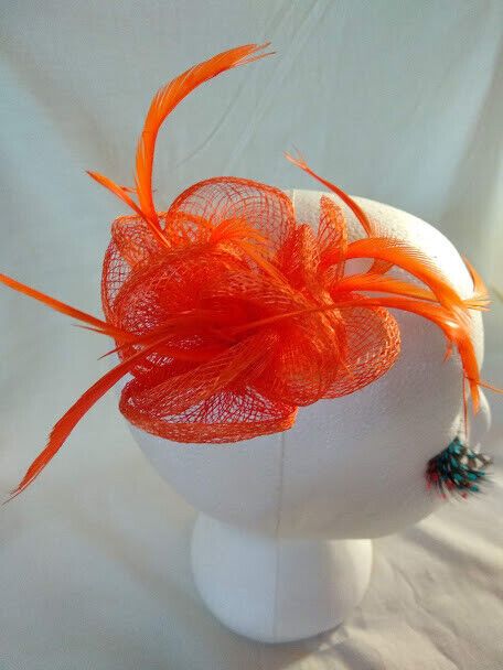 Bonito tocado para ceremonia color naranja con forma de flor confeccionado con rafia y plumas.