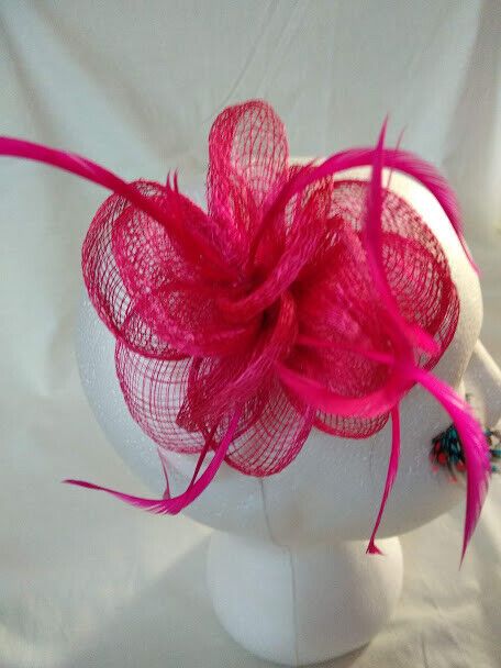 Bonito tocado para ceremonia color rosa fucsiacon forma de flor confeccionado con rafia y plumas.