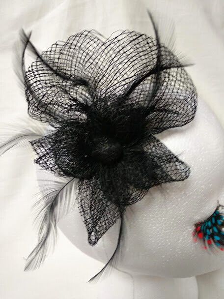 Bonito tocado para ceremonia color negro con forma de flor confeccionado con rafia y plumas.