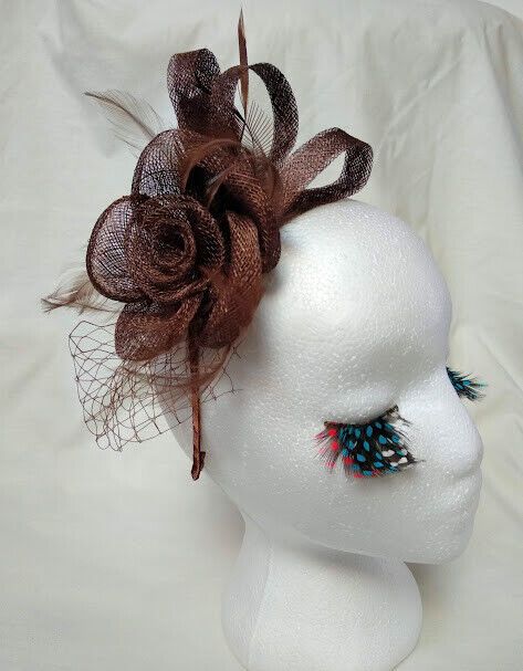 Bonito tocado para ceremonia color marrón con forma de flor confeccionado con rafia,redecilla y plumas.