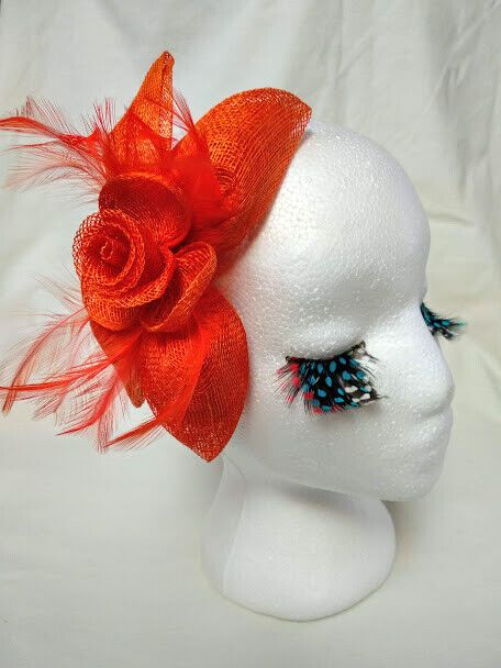 Bonito tocado para ceremonia color naranja con forma de pequeño casquete vertical con flor confeccionado con rafia y plumas.