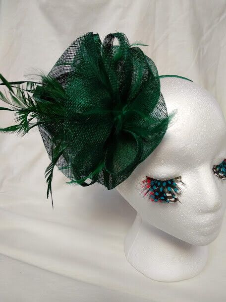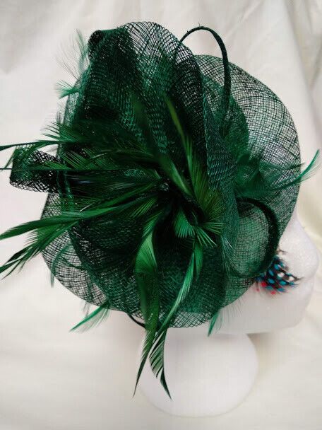 Bonito tocado para ceremonia color verde con forma de flor confeccionado con rafia y plumas.