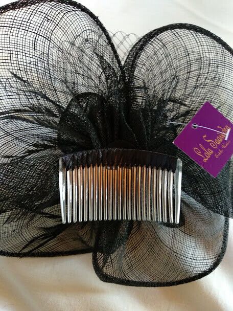 Bonito tocado para ceremonia color negro con forma de flor confeccionado con rafia,plumas y redecilla.